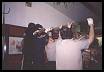 As you enter the temple, the ornate wooden gate to the porch and the fanciful gables and cornices on the building set the Oriental theme. The front of the building is painted bright blue with white lines to resemble the tile on the temple's Chinese prototype.