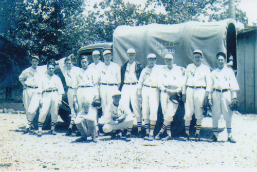 The boys loved their baseball, both as players and fans. The Humboldt Redwoods camp fielded a winning team, pictured at the top of this page. The camp newsletter article at right indicates that the Humboldt Redwoods baseball team was integrated long before major league baseball, until the "colored" members of company 925 were moved to a segregated company at Camp San Pablo Dam. (Click on the link after the article image to read a transcription.)