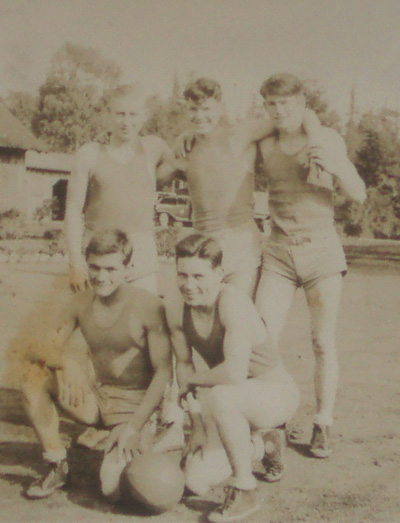 The CCC administration encouraged organized sports. Teams played against other CCC camps and local teams. Russian Gulch's basketball team is shown above, a fine team of players all over 6'2", according to the photo album caption for this shot. Boxing was very popular at all the CCC camps. It was a sporting event and also a way to settle disagreements. The photo below, taken at the Humboldt Redwoods CCC camp in Dyerville, could be of either sport or two-fisted diplomacy.