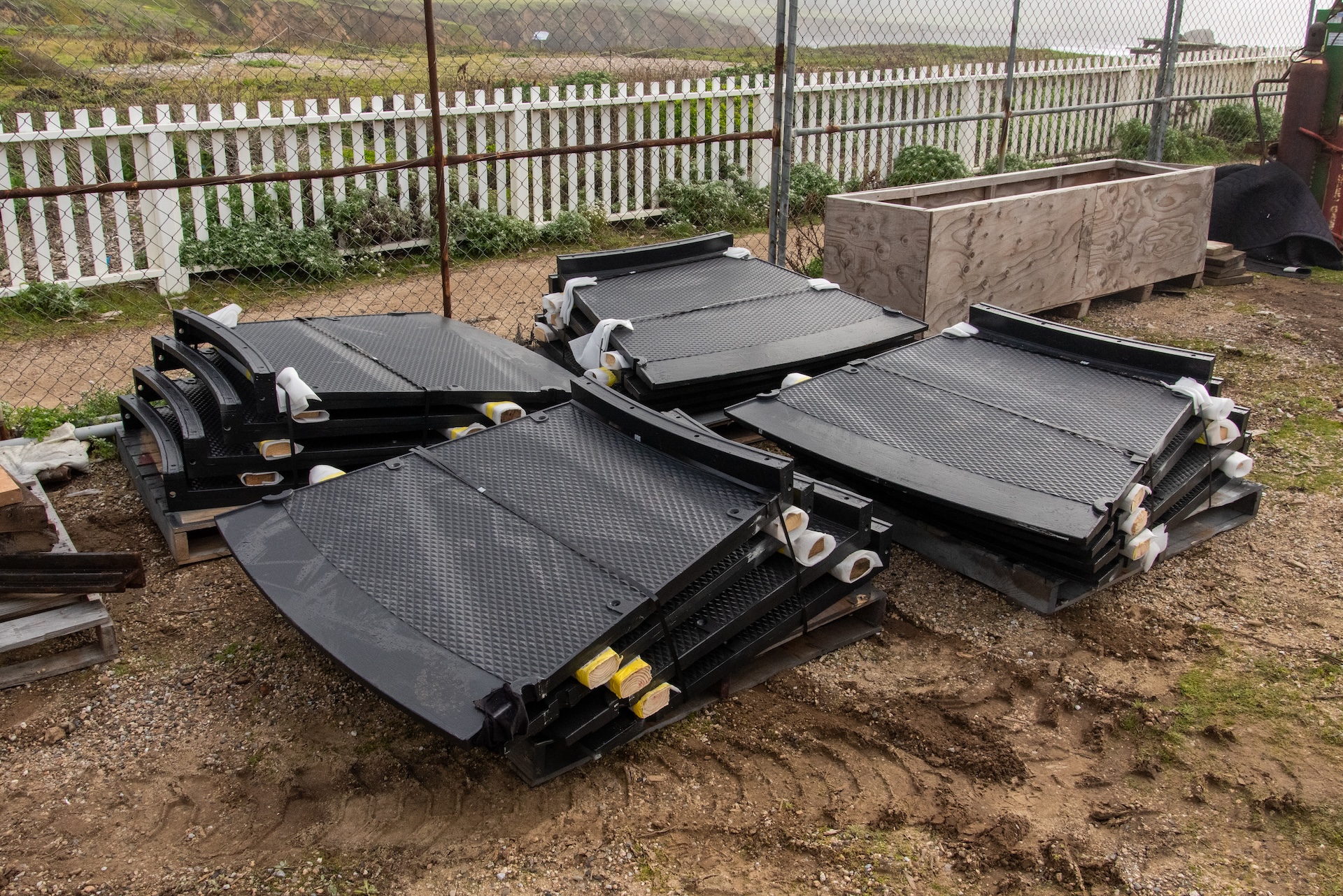 The remaining stainless steel replacement parts have arrived and are being stored onsite in preparation for mounting near the top of the lighthouse. New deck plates, railings, and support brackets await the demolition of the service room walls. The demolition will be done in phases to ensure the stability of the tower.